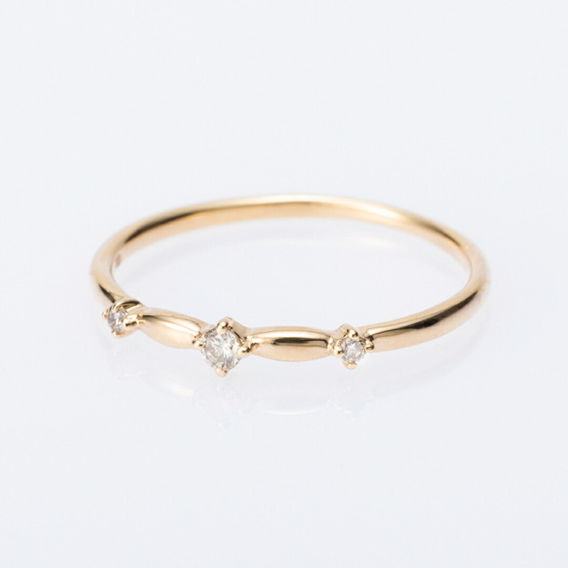 一見シンプル&細身ですが、身につけると3石のダイヤモンドが輝き、 華やかな輝きのイエローゴールドは遠くからみてもぱっと目を惹きます。