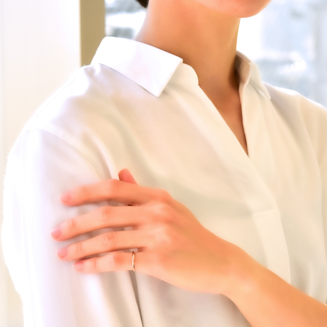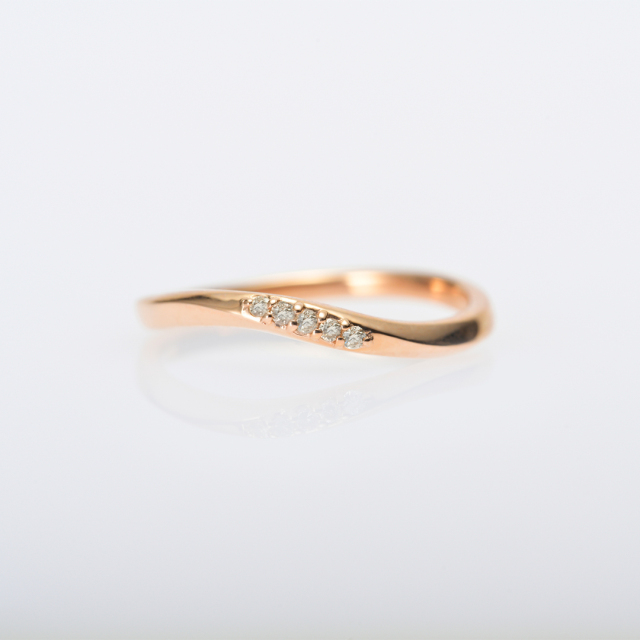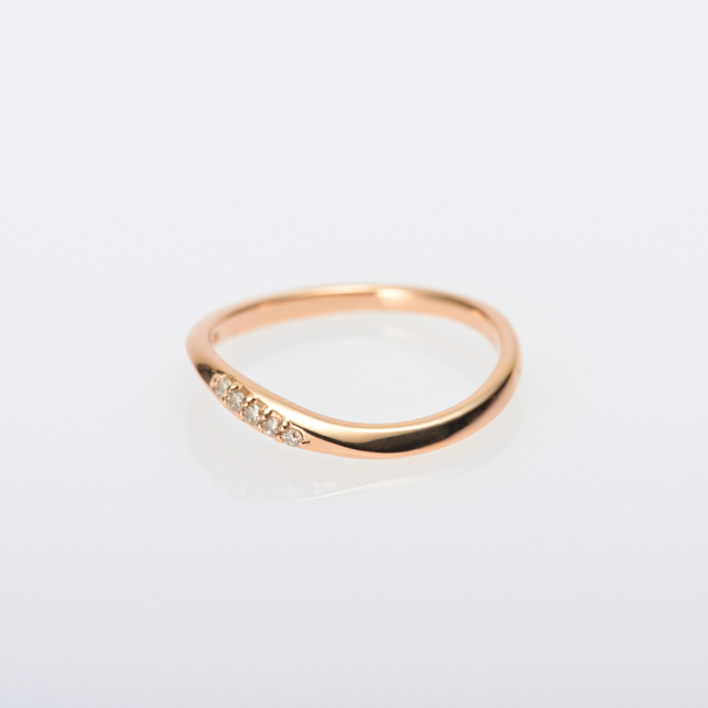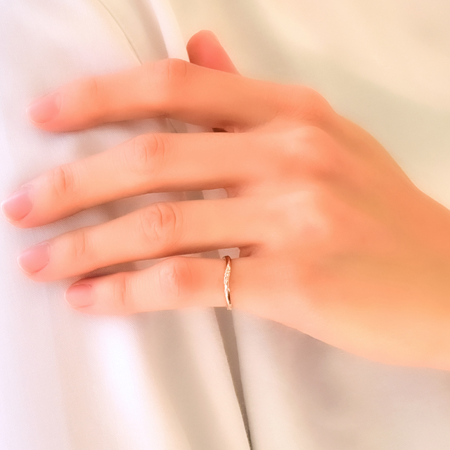 デイリーにもオフィスにも…シーンを選ばないシンプルなピンキーリング。 優しいウェーブラインがダイヤを包み込むようなデザイン。角度を変えるときらきらと輝きを放ち、手元を華やかに彩ります。 肌馴染みの良いピンクゴールドと華奢な可愛さの中にも上品さを兼ねそろえ、身に付けているだけで、ハッピーな気分に。 お手持ちのリングとの重ね着けもおすすめですよ。自分へのご褒美や、愛する人に可愛らしいリングをプレゼントに贈ってみませんか。