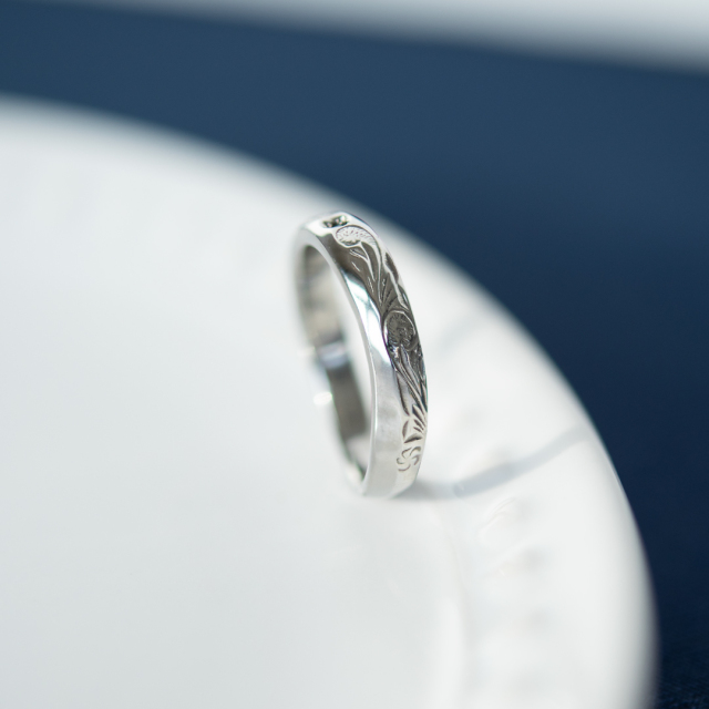 幸せを呼ぶ石と言われるブルーダイヤモンドも中央に一粒セットされており、 メンズレディース兼用のデザインなので、2本ご注文頂いてペアリングとしてもお使い頂けます。