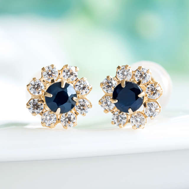 深みのあるブルーが美しい9月の誕生石サファイアとそれを取り囲む8石のキュービックの花びら。