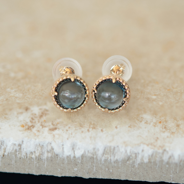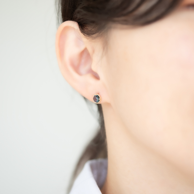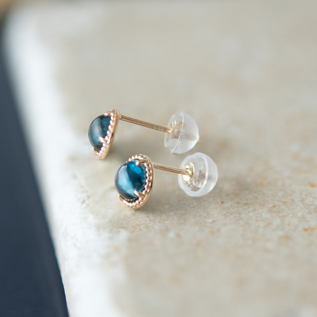 その魅力的なブルーを引き立てるK10素材の上質なピアスは、シックで落ち着いた色合いが知的な雰囲気を演出。
