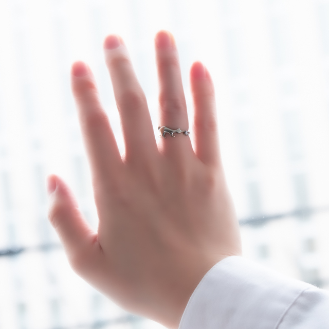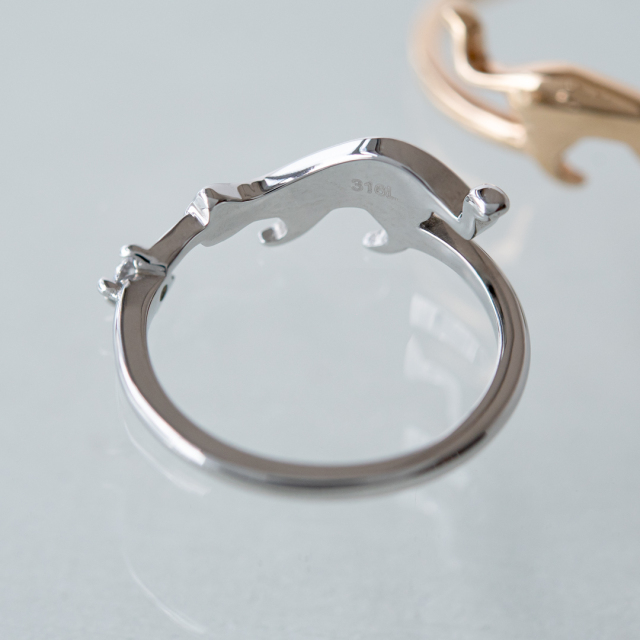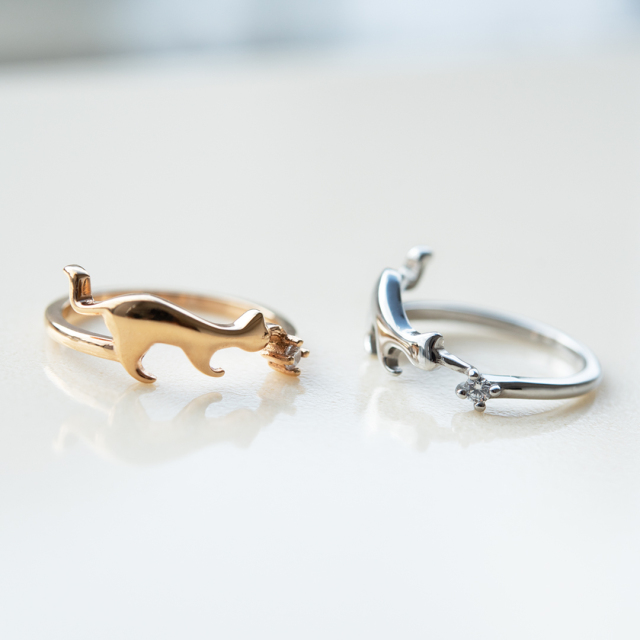 今にも猫ちゃんが動き出しそうな躍動感のある、猫好きにはたまらないデザインリング。
