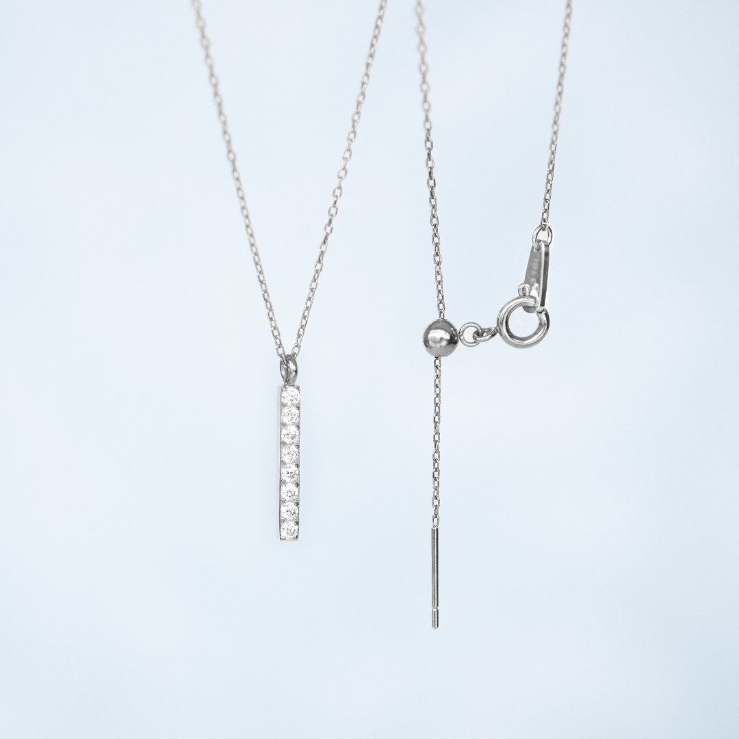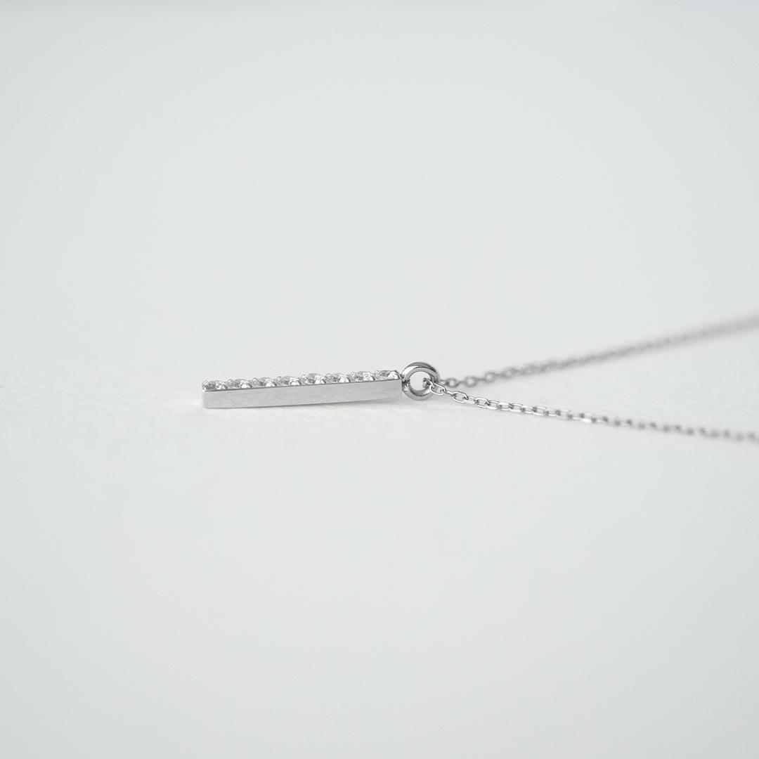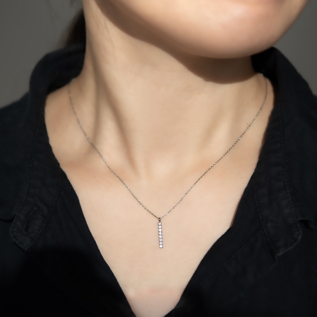 縦に連なるキュービックジルコニアが、さりげなく胸元を輝かせるネックレス。