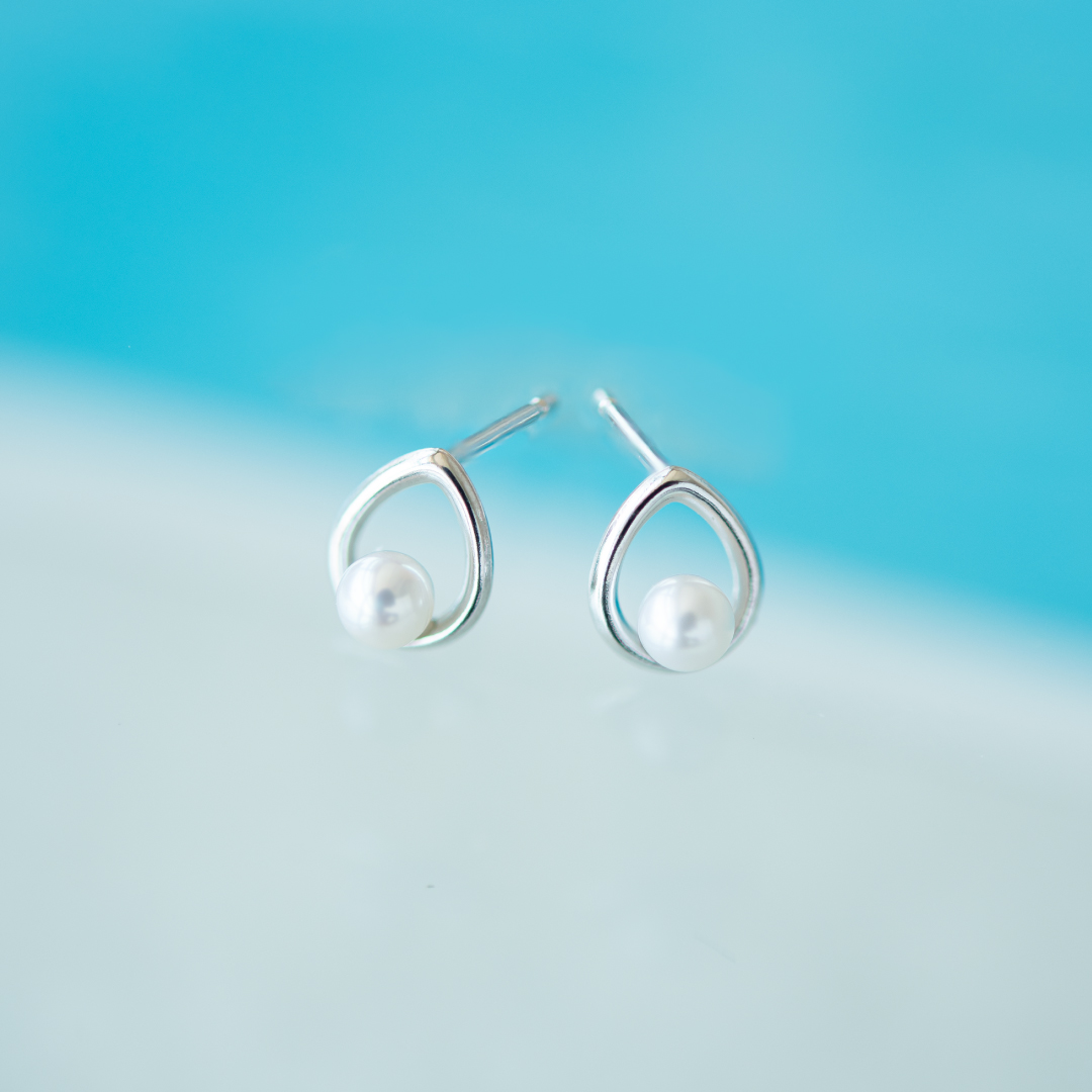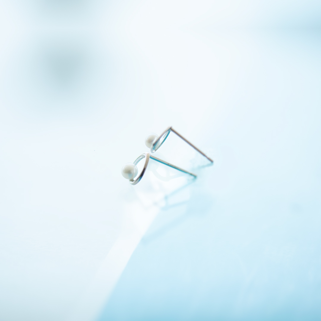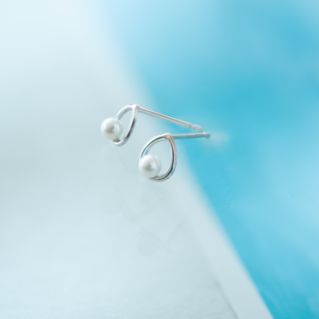 しずく型のホワイトゴールドの地金のラインに淡水パールをあしらったデザインです。