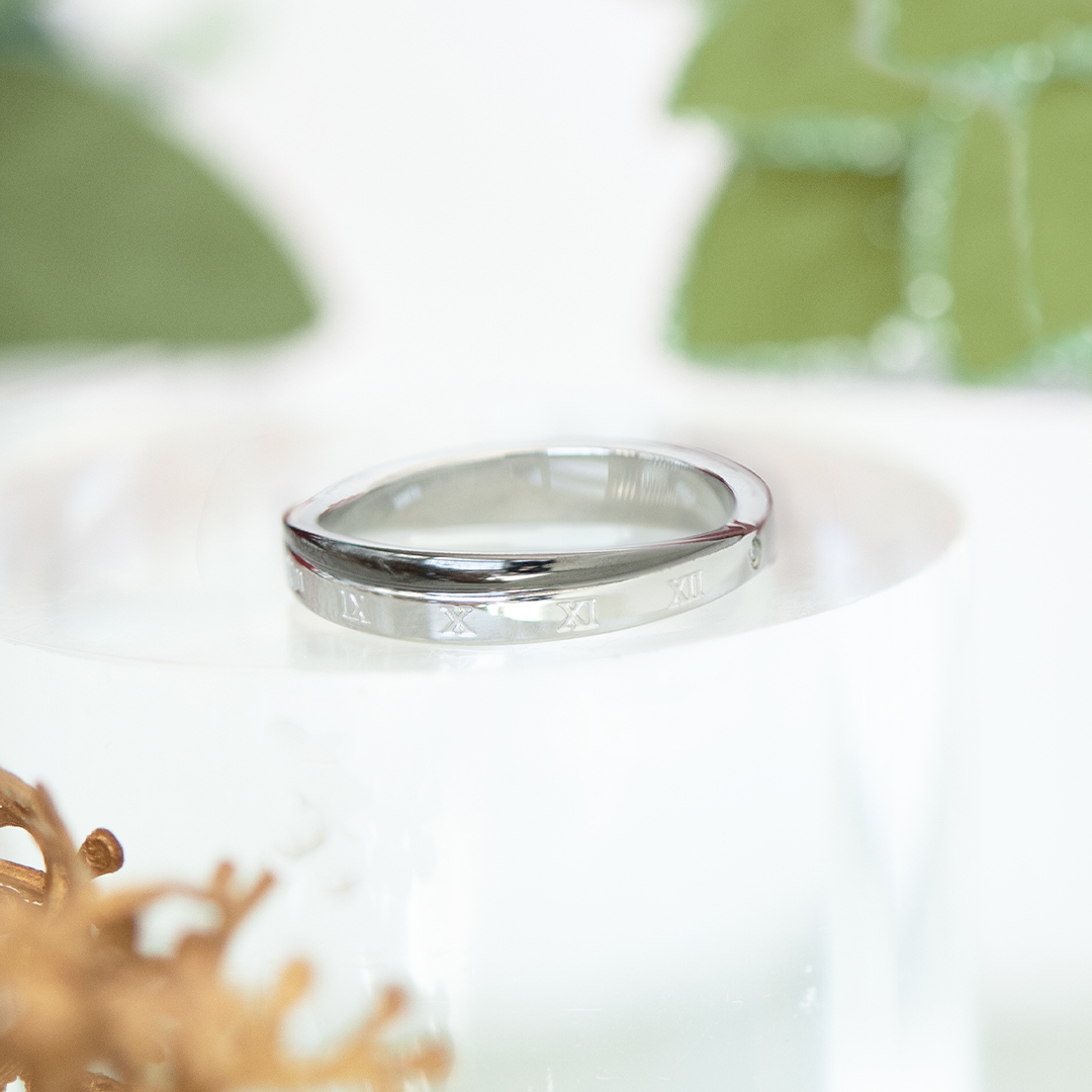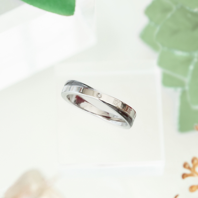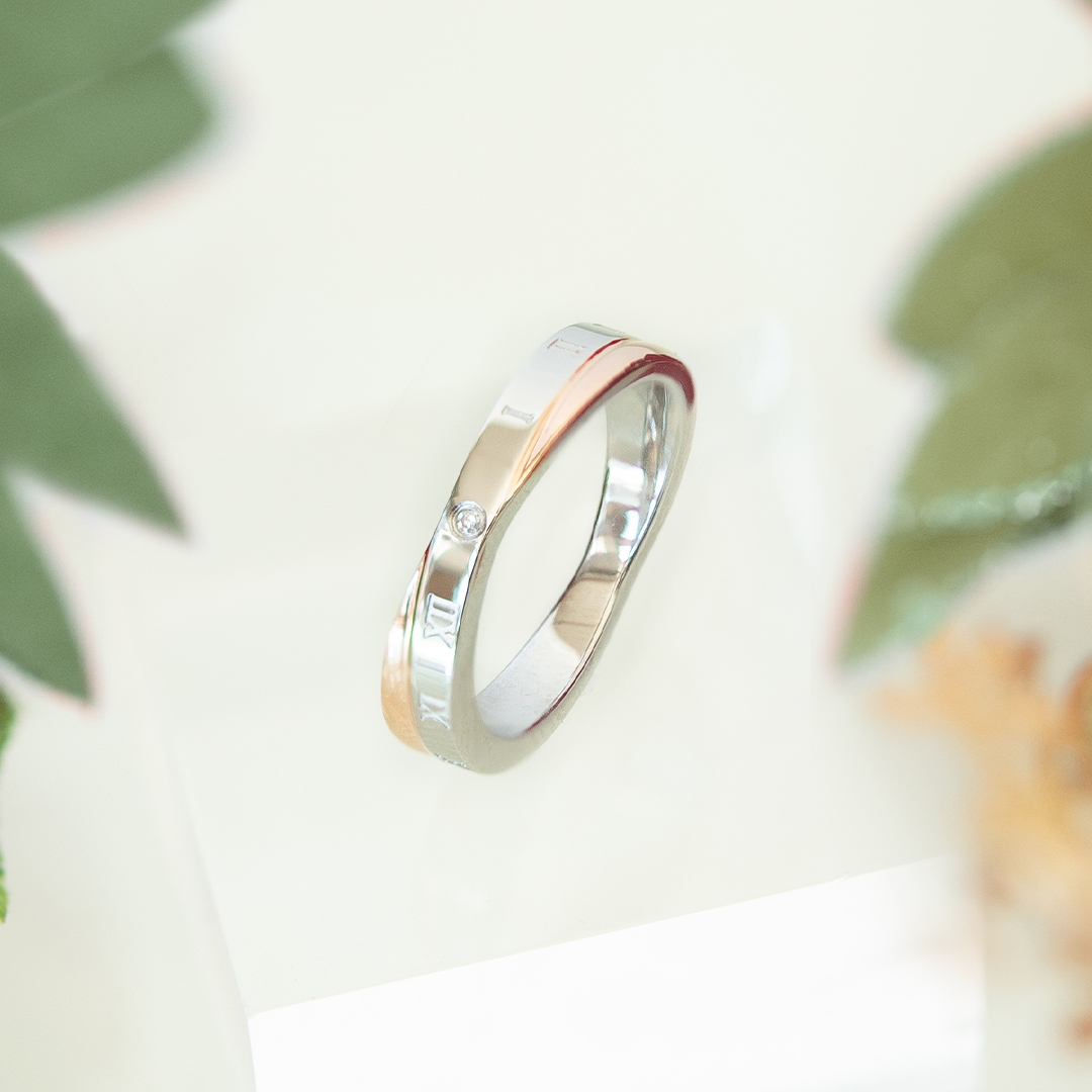 時計の文字盤のように刻まれた数字デザインと、永遠の絆を意味するダイヤモンドをセットしたリング。