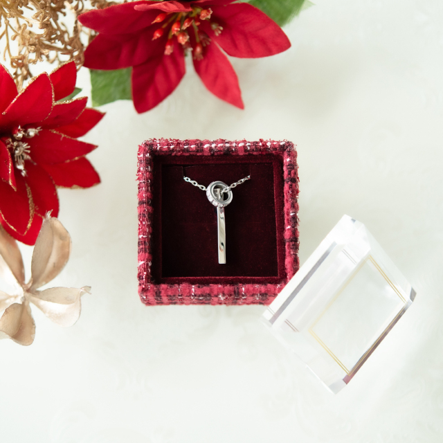 上品で温かみのある赤いツイードのボックスがジュエリーを包み込み、特別なものにしてくれるはず!