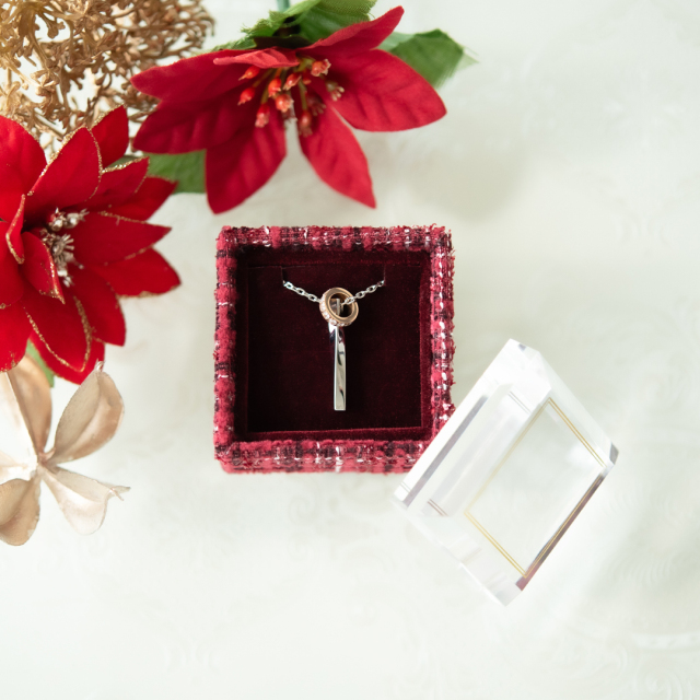 上品で温かみのある赤いツイードのボックスがジュエリーを包み込み、特別なものにしてくれるはず!