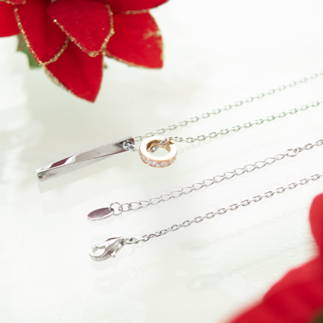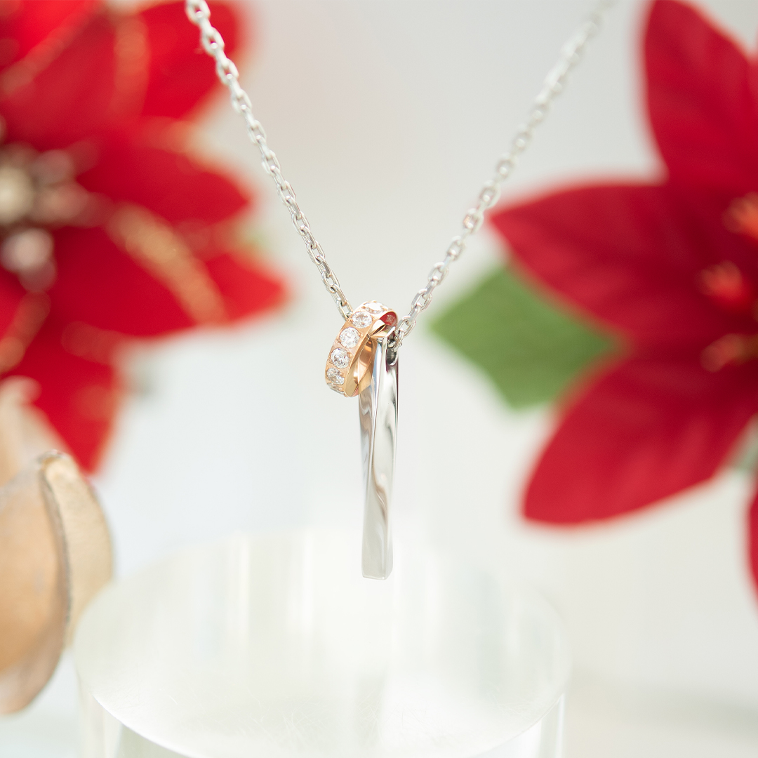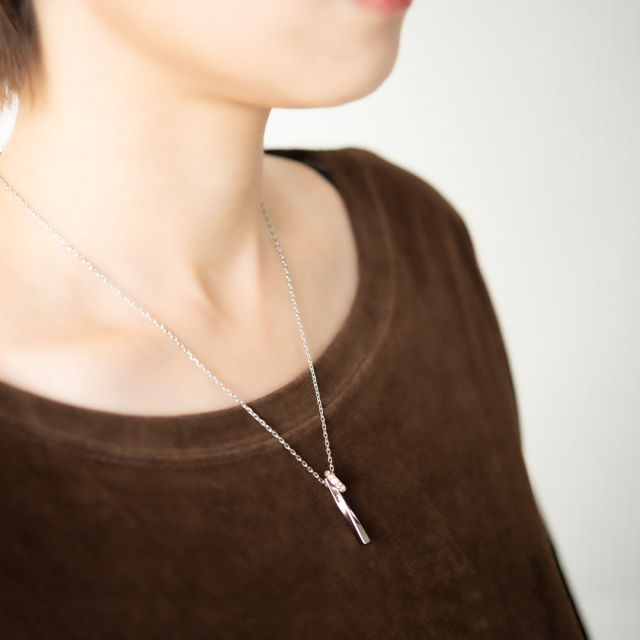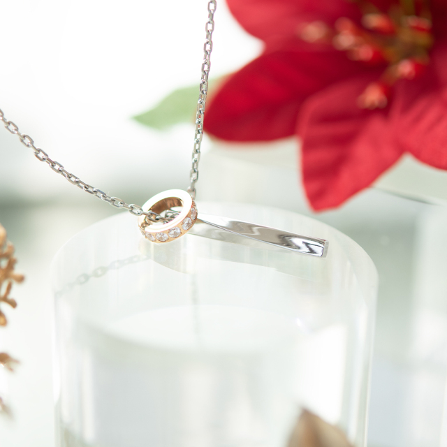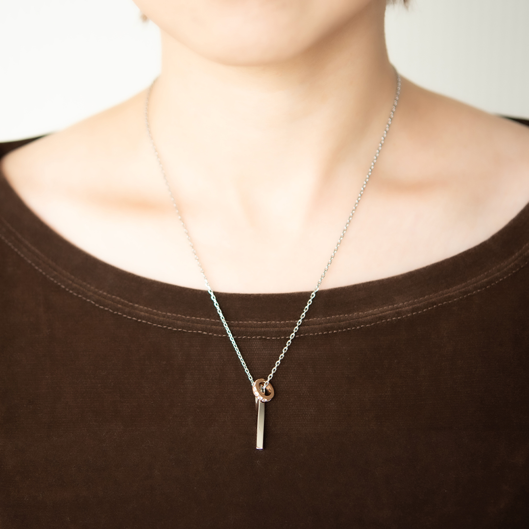 曲線の美しいスティックと、キュービックジルコニアが煌めくサークルチャームが寄り添うロマンチックなネックレス。