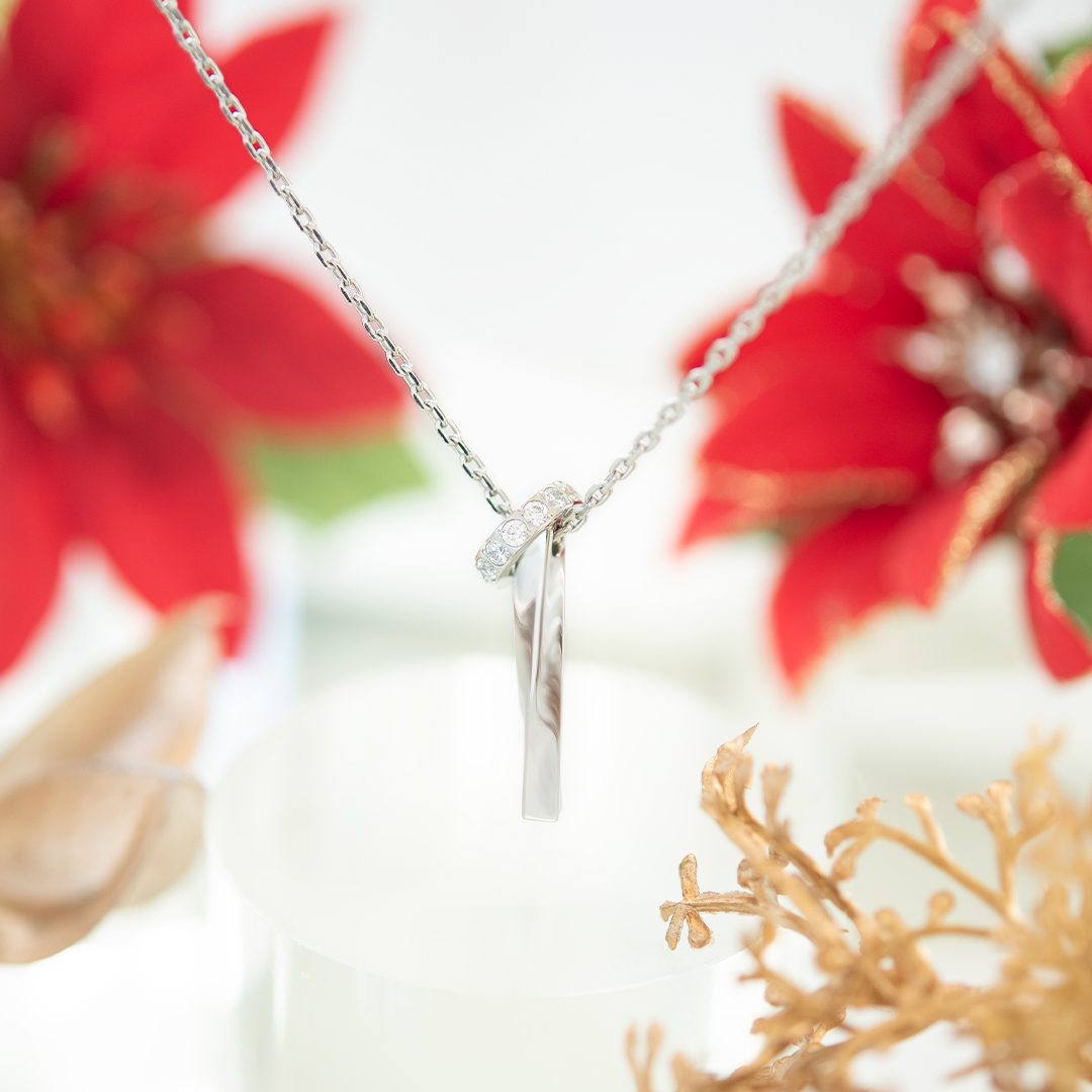 曲線の美しいスティックと、キュービックジルコニアが煌めくサークルチャームが寄り添うロマンチックなネックレス。