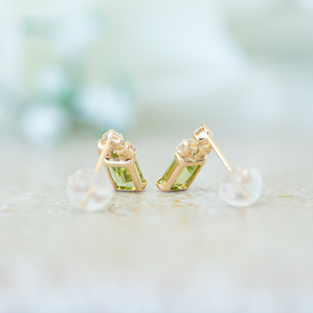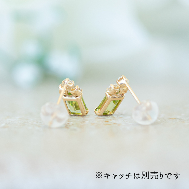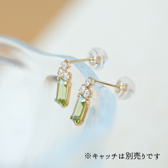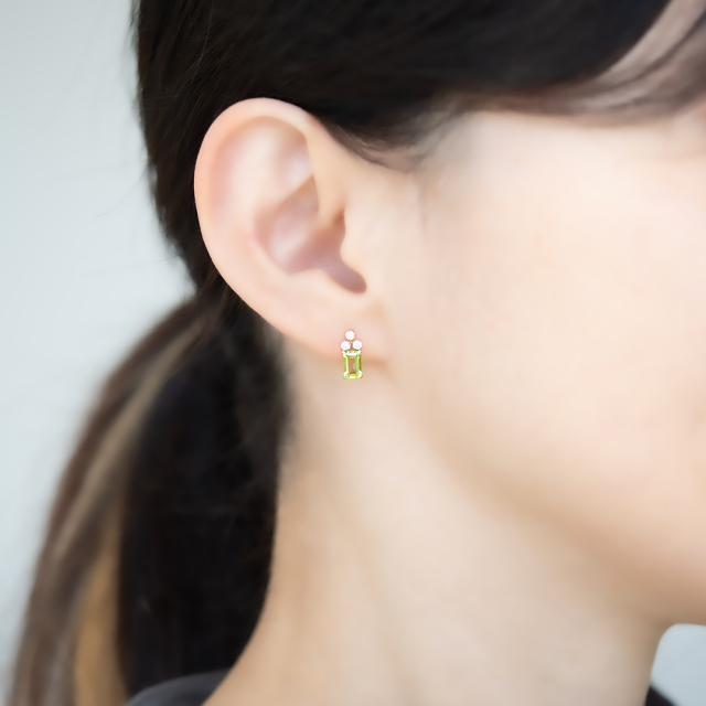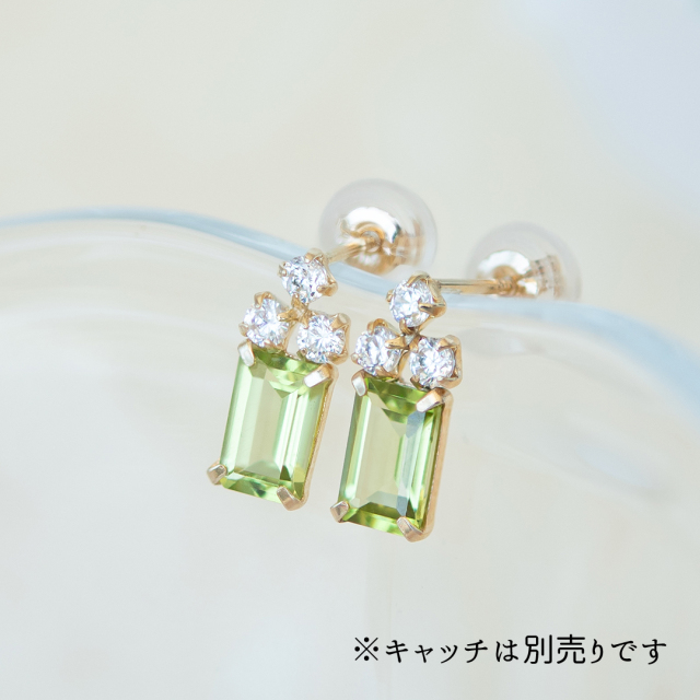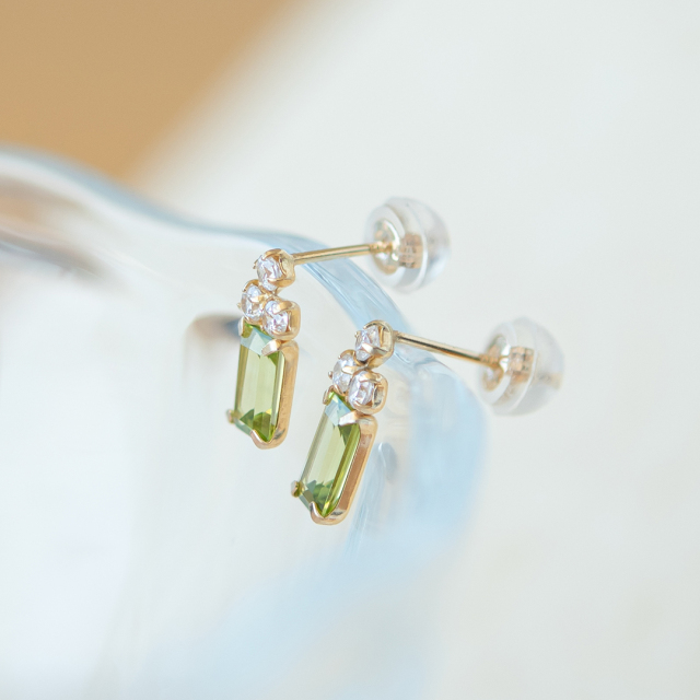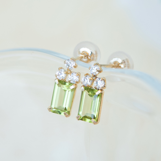 透明感のある爽やかなグリーンが魅力のペリドットにキュービックジルコニアが絶妙なバランスで寄り添うピアス。
