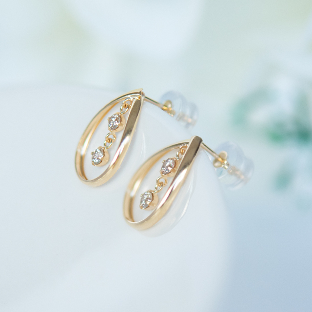 抜け感もあり、揺れるたびに様々な角度から光をとり込んで煌めく優しく温かみのあるデザインのピアスです。