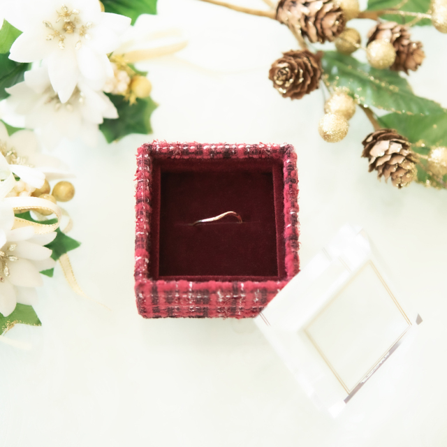 上品で温かみのある赤いツイードのボックスがジュエリーを包み込み、特別なものにしてくれるはず!