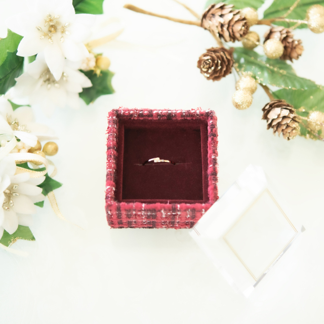上品で温かみのある赤いツイードのボックスがジュエリーを包み込み、特別なものにしてくれるはず!