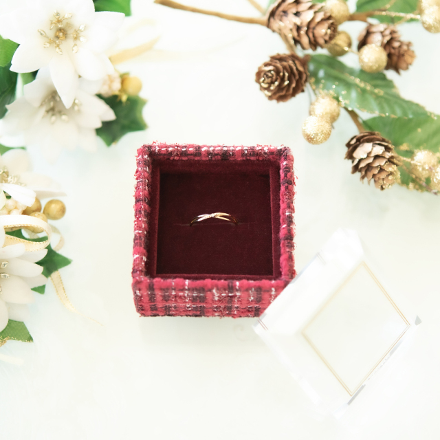 上品で温かみのある赤いツイードのボックスがジュエリーを包み込み、特別なものにしてくれるはず!