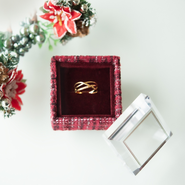上品で温かみのある赤いツイードのボックスがジュエリーを包み込み、特別なものにしてくれるはず!