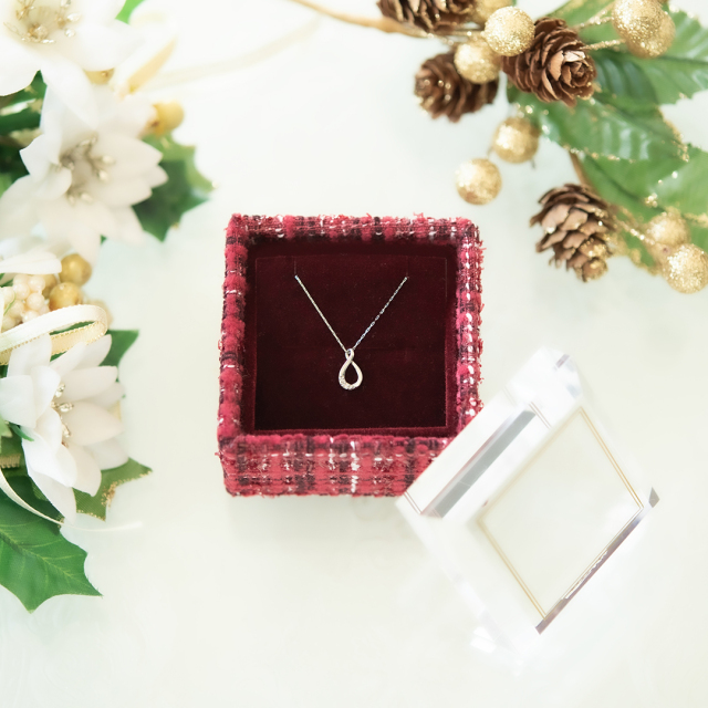 上品で温かみのある赤いツイードのボックスがジュエリーを包み込み、特別なものにしてくれるはず!