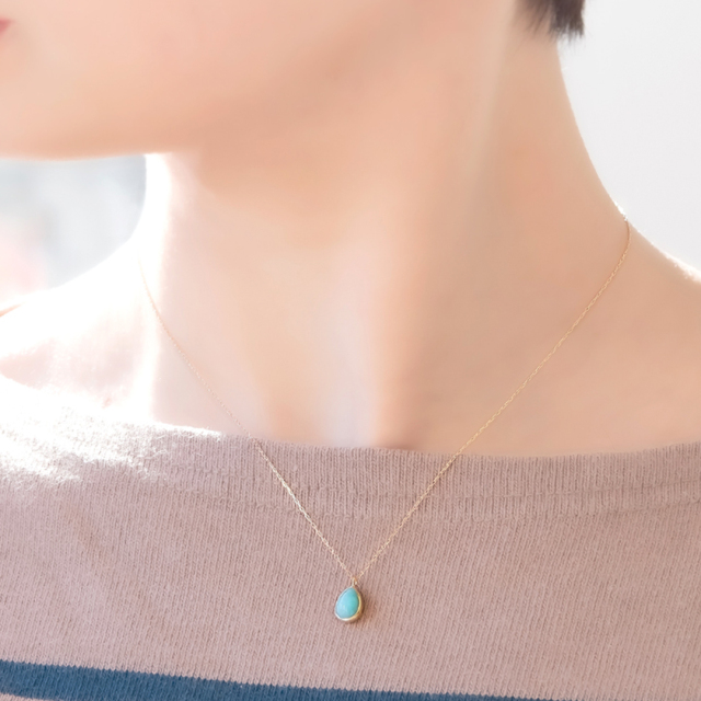 胸元に雫型の天然石が揺れるシンプルなネックレス。
