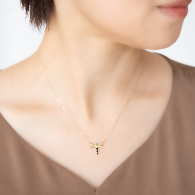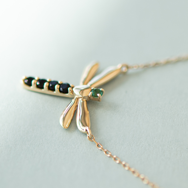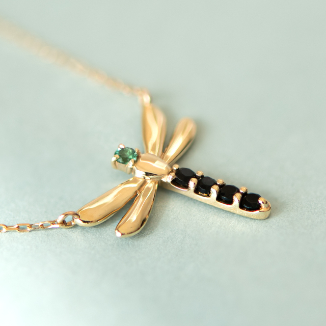 日本で最大のトンボとして知られるオニヤンマをイメージして、頭の部分は爽やかな深みのあるグリーンクォーツ、広げた羽根はK10イエローゴールドを使用。