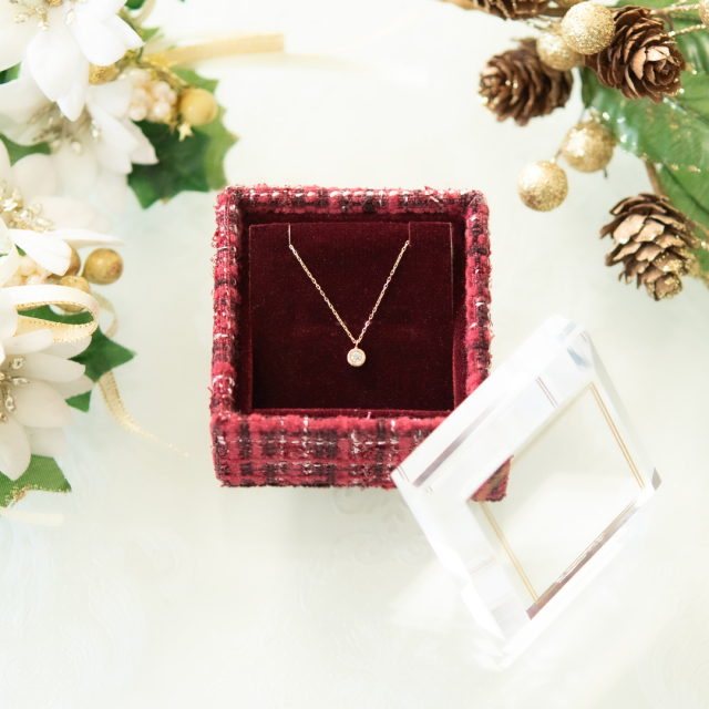 上品で温かみのある赤いツイードのボックスがジュエリーを包み込み、特別なものにしてくれるはず!