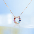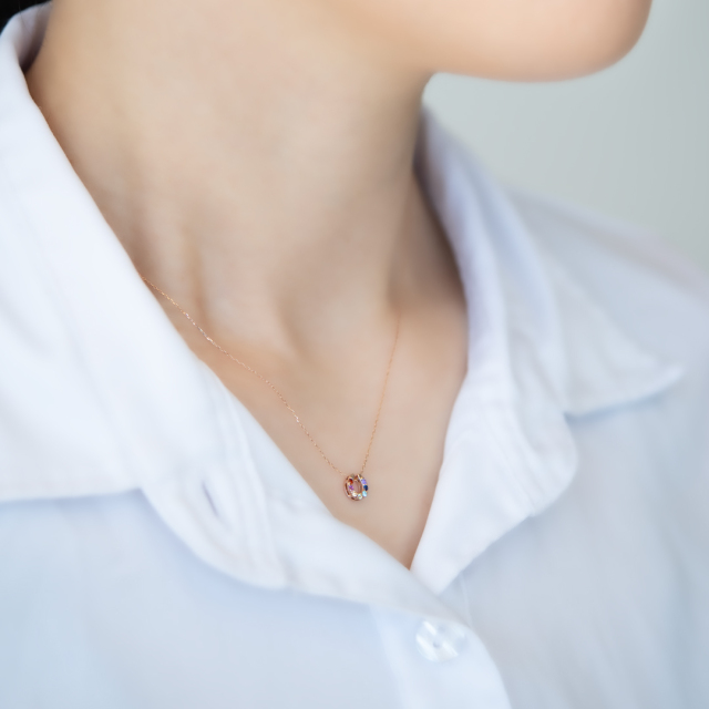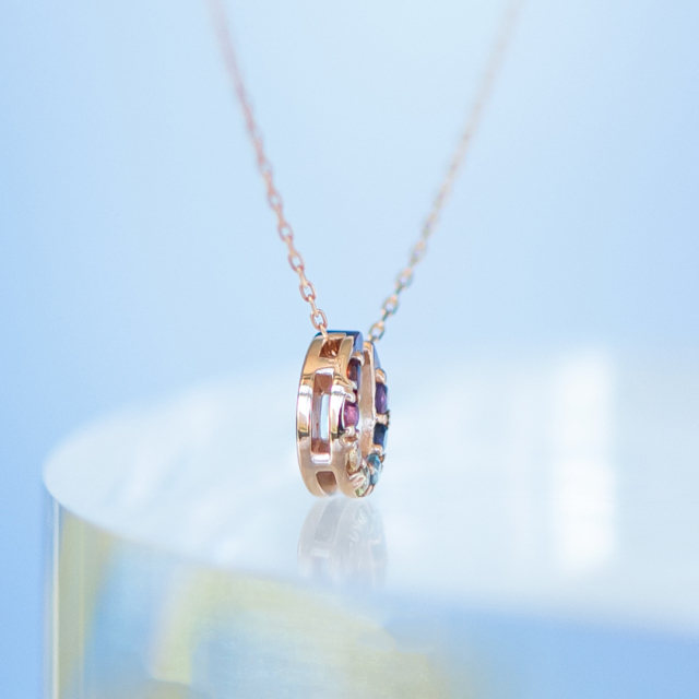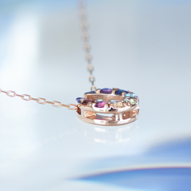 モチーフのラインに添ってマルチカラーの天然石が煌めき、胸元をハッピーに彩ります。