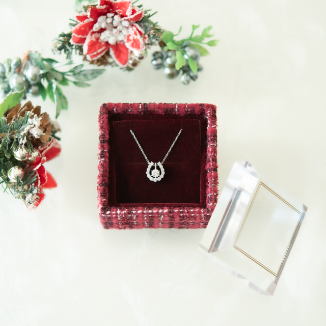 上品で温かみのある赤いツイードのボックスがジュエリーを包み込み、特別なものにしてくれるはず!