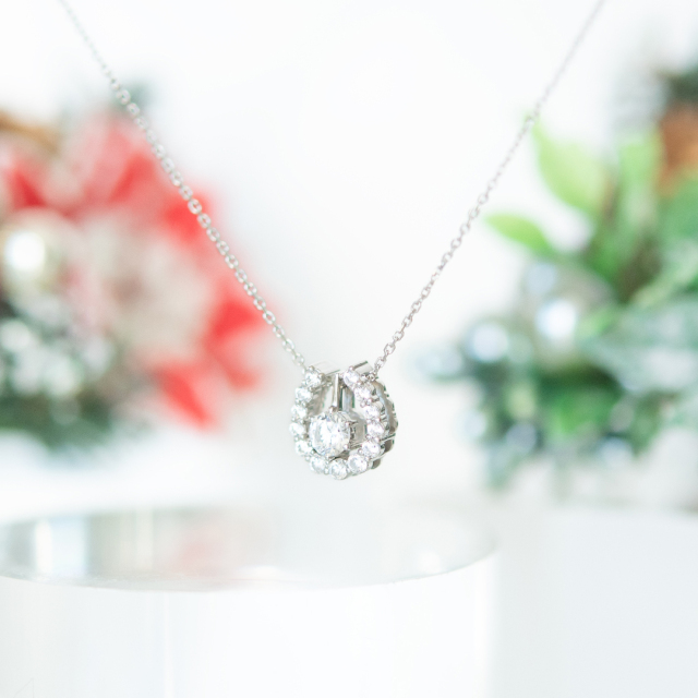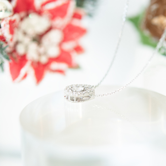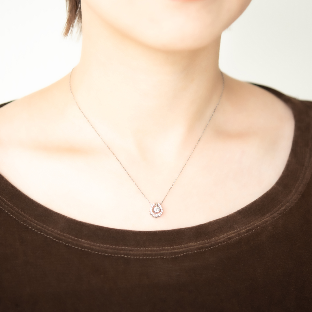中央と周囲にあしらわれたキュービックジルコニアが、角度によってきらめきを放ちます。
