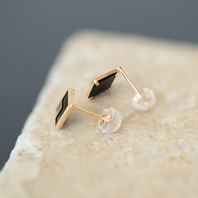 深い漆黒のオニキスと、イエローゴールドのコントラストがクールな存在感を放つスタッドピアス。