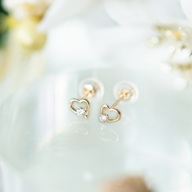 耳元に寄り添う繊細で愛らしいオープンハートのピアス。