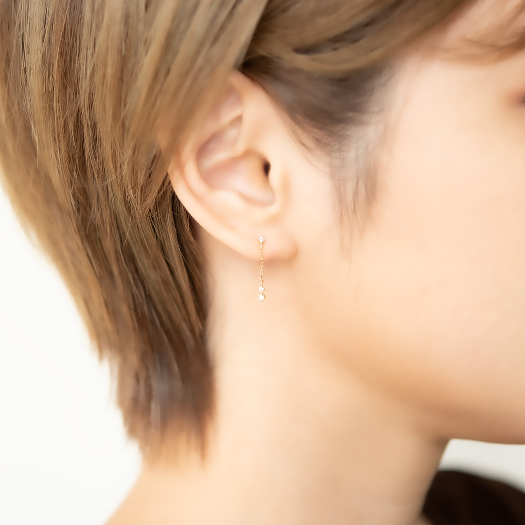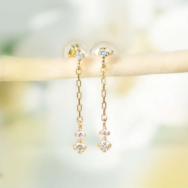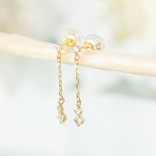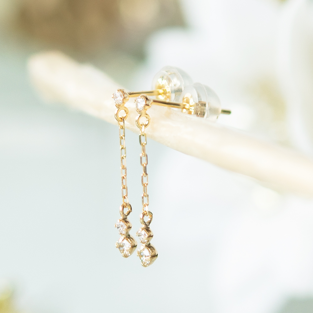 繊細なチェーンに3石のダイヤモンドがきらめく、華奢で上品なピアス。