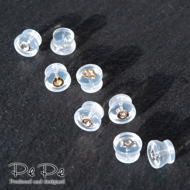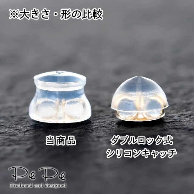 地金のキャッチをシリコンで包むことで、地金や、シリコンだけのキャッチよりもしっかりとピアスを留めることが出来るダブルロックキャッチ。