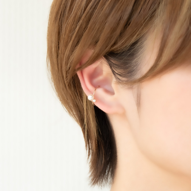 シンプルなK10イエローゴールドのラインにコロンとしたパールと一粒キュービックジルコニアを寄り添わせたデザインのイヤカフ。