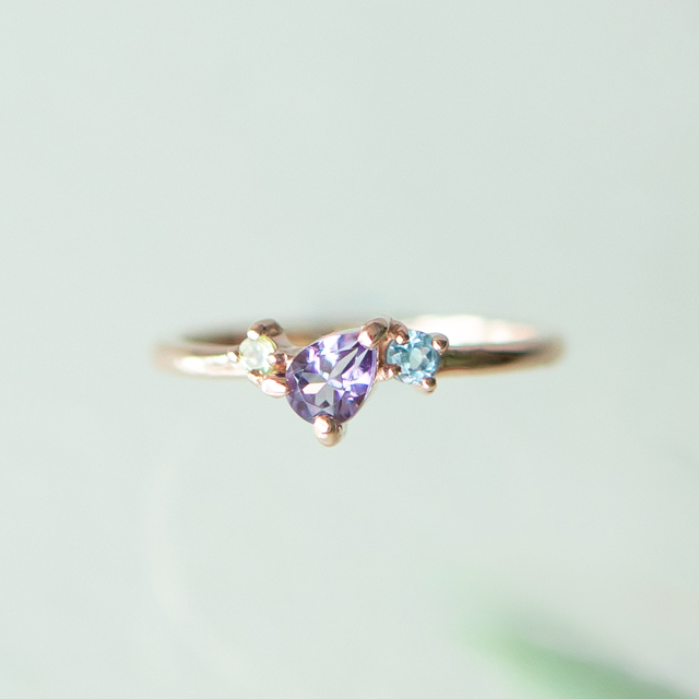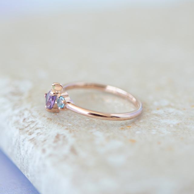 コンパクトでミニマムなサイズのピンキーリングは、多彩な天然石を組み合わせることで存在感のあるデザインに。