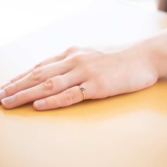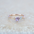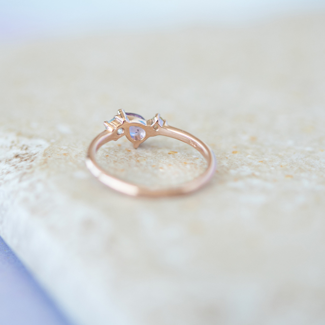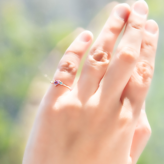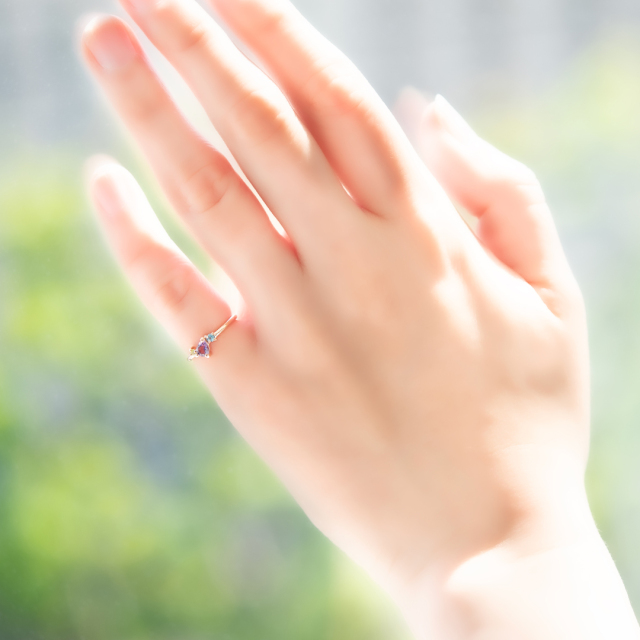 ペアシェイプカットを施したアメジストは、角度を変えるたび、きらきらとドラマチックに輝きます。