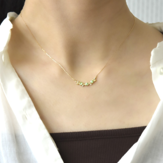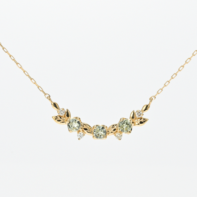 どんなファッションにも調和するリーフタイプのネックレスは、ミントガーネットの発色が優しく、合わせる洋服を選びません。