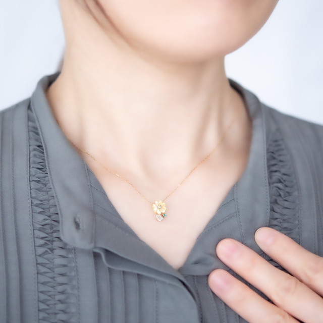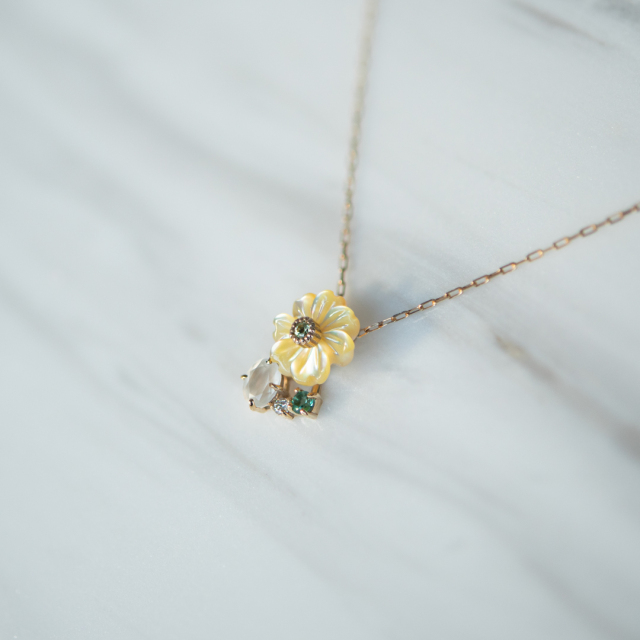 爽やかな色味のグリーンクォーツの葉にムーンストーン、ダイヤモンドが寄り添った明るい色彩に、心もぱっと華やぎそうです。