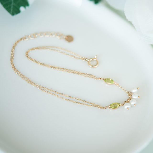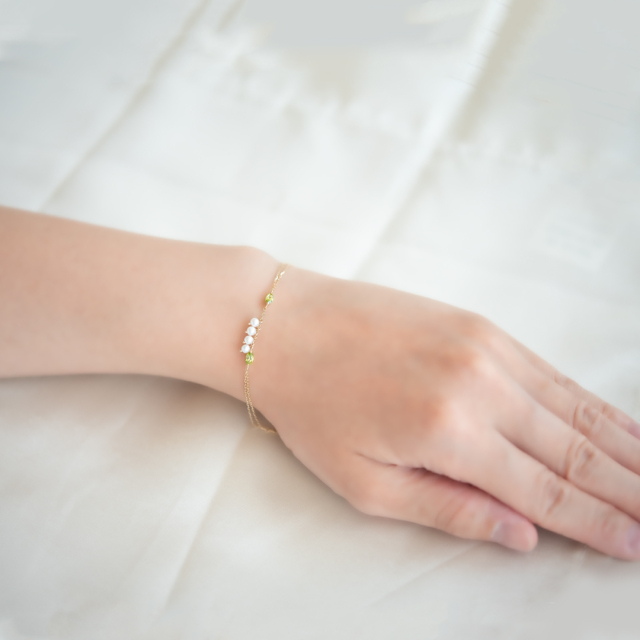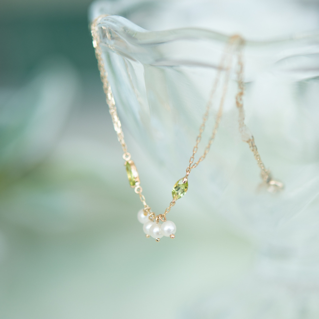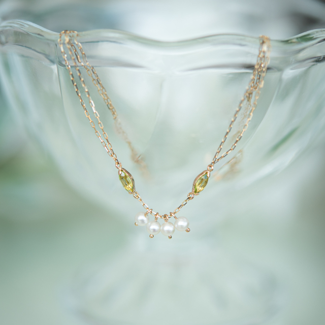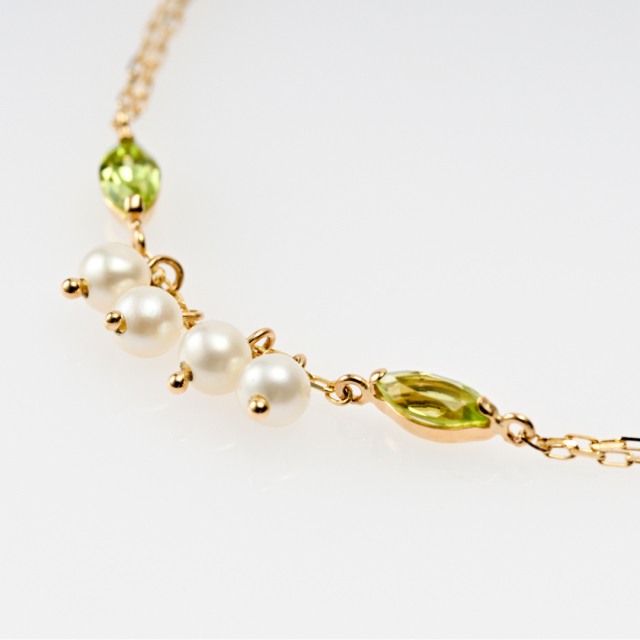 柔らかさのある清楚な輝きが魅力の淡水パールをベル型のお花に見立て、花に寄り添う葉の部分はフレッシュなグリーンが特徴のペリドットで表現。