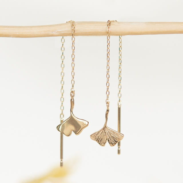 見上げるように空に向かったイチョウの巨樹からひらひらと舞う黄葉をデザインしたイチョウのピアス。