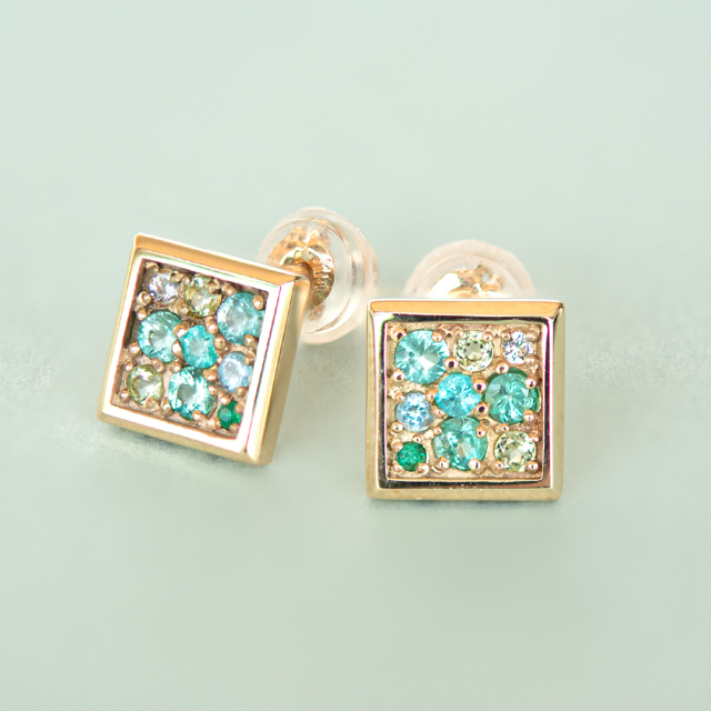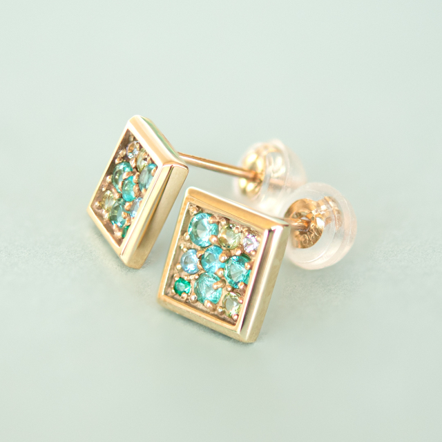 額縁に見立てたスクエアの中に春夏秋冬をイメージした天然石が煌めく四季シリーズ。