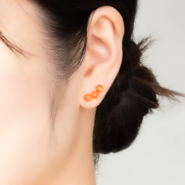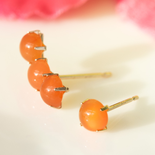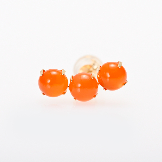 こぼれいくらをイメージしたジュエリーは、カーネリアンにカボションカットを施すことでつるんとしたいくらの質感を表現。 今にもプチっと弾けそうなリアルな仕上がりで、遊び心たっぷりなデザインピアスです。