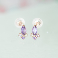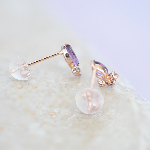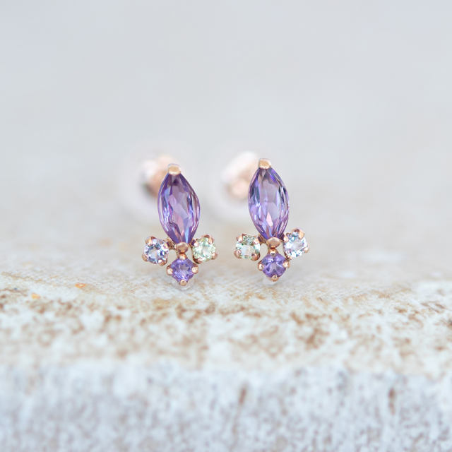 多数の面を持つマーキスカットを施したアメジストは光を受けて美しい輝きを放ち、優しく肌馴染みのよいK10ピンクゴールド素材と絶妙に調和します。