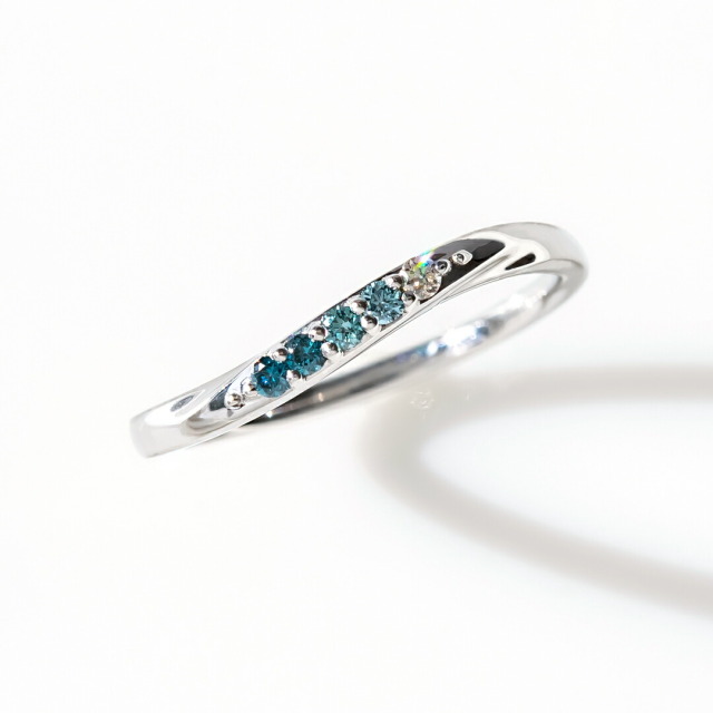 細身ですが程良いボリューム感もあり、聡明で気品に満ちた瑞々しく輝くブルーダイヤモンドとホワイトダイヤモンドのグラデーションが美しいシンプルデザイン。