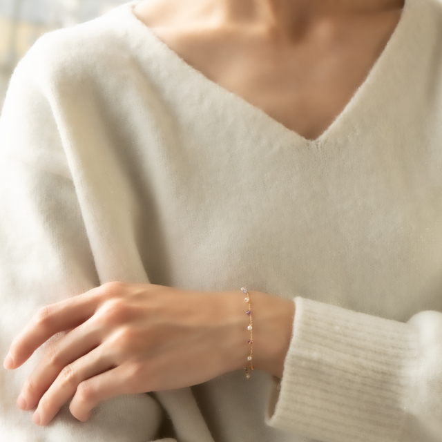 淡水パールと優しい色合いのカラフルな天然石達が交互に並び、お手元を華やかに彩ります。 繊細で華奢なチェーンが、小粒なモチーフと合わさって清楚でかわいらしい印象を与えてくれます。