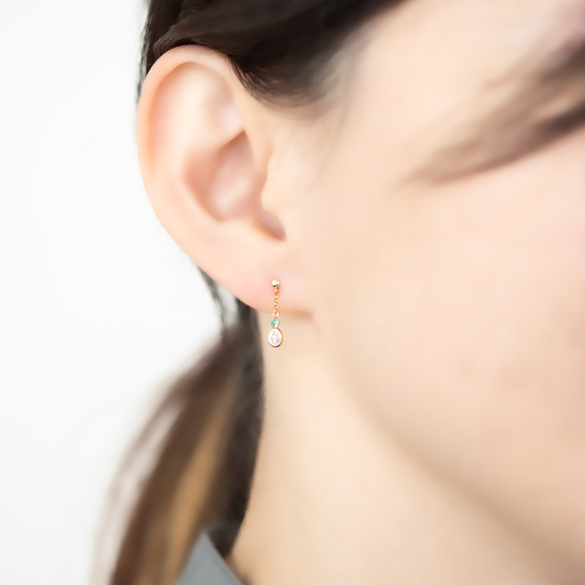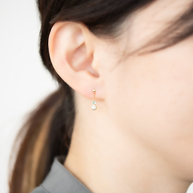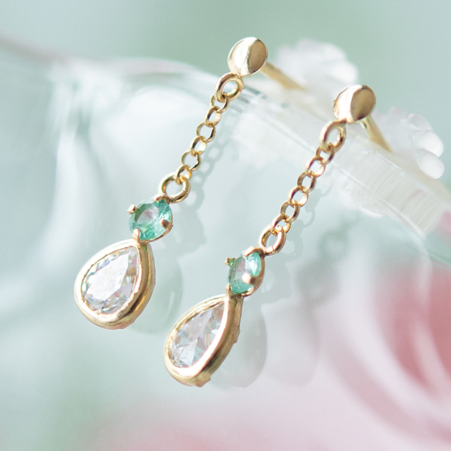 縦に寄り添うエメラルドがアクセントになり、 ふとした仕草でふるふる揺れるかわいらしいピアスです。