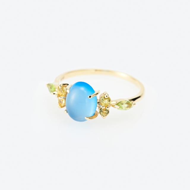 カボションカットのシーブルーカルセドニーがウルウルで、寄り添うイエローサファイアとペリドットが可愛いです! 10Kを購入しましたが18Kにすれば良かったなと思うくらい、長い間大切にしたい素敵なリングでした。